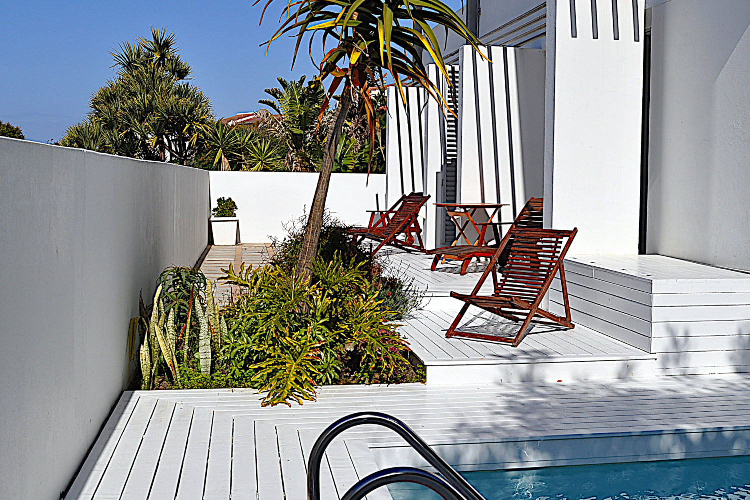 There is a patio with patio furniture, an outdoor dining table and a barbeque / braai. There is also a courtyard area with a swimming pool.