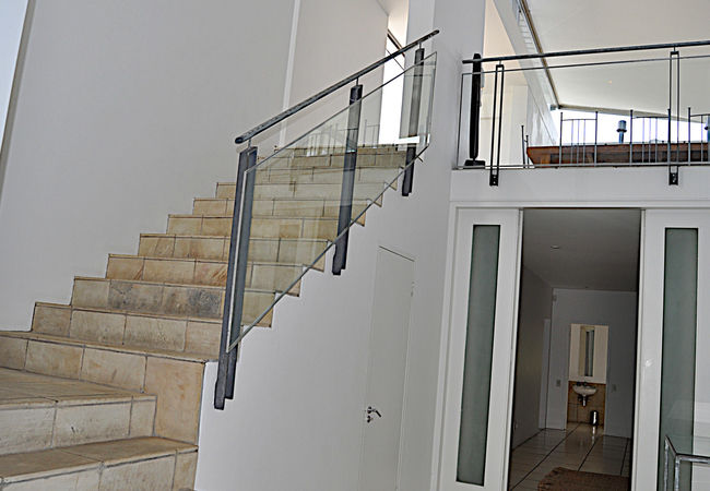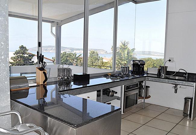 The villa sleeps eight guests in four bedrooms. There are four bathrooms and linen and towels are provided. The bedrooms are downstairs and two of them open out onto the deck. The first and second bedroom are en-suite and then there are two standalone bathrooms. The living area is open plan and consists of a spacious and comfortable lounge area with a fireplace and floor to ceiling windows and sliding doors. A dining room table where you can enjoy your meals is situated in the centre of the kitchen which is fully equipped. There is a patio with patio furniture, an outdoor dining table and a barbeque / braai. There is also a courtyard area with a swimming pool.