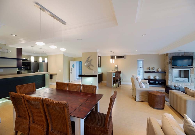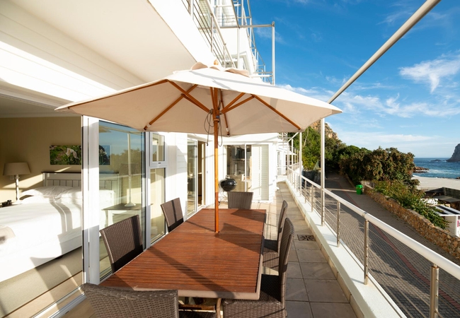 There is a fully equipped kitchen and a separate scullery and laundry. The apartment boasts a bar, dining area, lounge with DStv and a reading nook. Outside there is a patio running the full length of the apartment with weber braai, dining table and sun loungers.