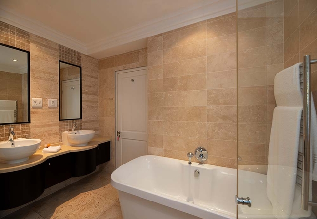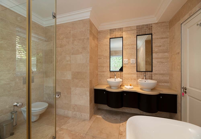 The third bedroom is furnished with an extra length double bed and is east facing and has no lagoon view. Bedrooms two and three share a spacious bathroom fitted with a bath, shower, toilet and basin.