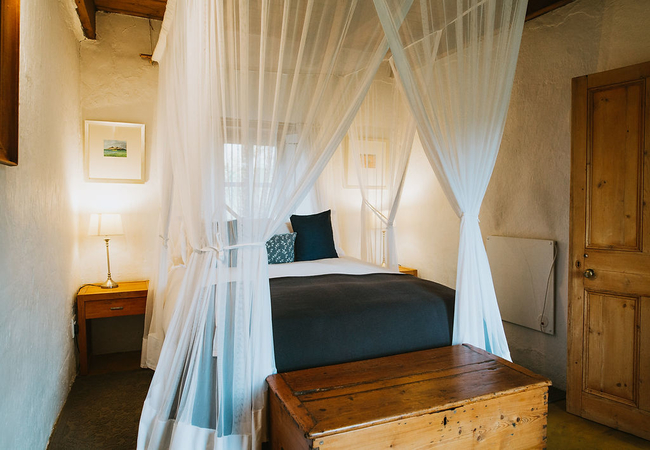 The Mill House has two two bedrooms and one bathroom. The main bedroom is furnished with a four-poster double bed and the second bedroom is furnished with two single beds. The kitchen is equipped with a fireplace, crockery, cutlery, utensils, small four-plate stove with an oven, microwave, fridge with a small freezer compartment, washing-up liquid and dishcloths, tea, coffee, sugar, salt and pepper. The open-plan living area a pull-out sleeper couch for two children, a small wood-burning fireplace, and electrical heaters. The living area leads out to a private patio, which offers braai area, a braai grid, plenty of wood, firelighters, candles and matches.