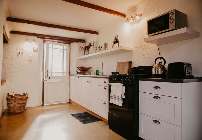 Fully equipped kitchen, with fire place, crockery, cutlery, utensils, small 2 plate stove with oven, microwave, fridge with small freezer compartment, wash liquid & dish cloths, tea, coffee & sugar