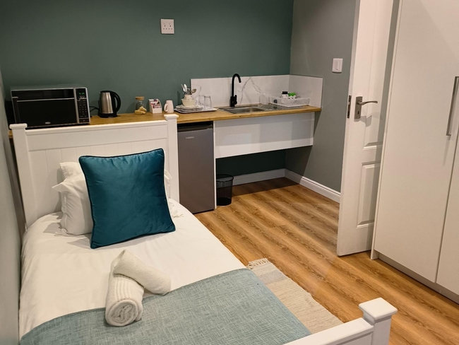 Our charming Double Room features a comfortable double bed and a spacious en-suite bathroom, complete with both a separate tub and shower. This well-appointed room includes a television for your entertainment, a desk for productivity, and a cozy seating area. For added comfort, it is equipped with an electric blanket and an air conditioning unit. The open-plan layout includes a lounge area and a kitchenette, which is fitted with a microwave, a bar fridge, and coffee/tea making facilities. Additional amenities include complimentary Wi-Fi, DSTV/satellite TV, a ceiling fan, and a non-smoking environment. Daily cleaning service ensures a pristine stay, while a hairdryer and essential bathroom toiletries add to your convenience.