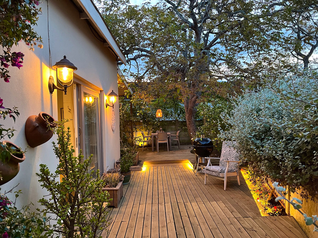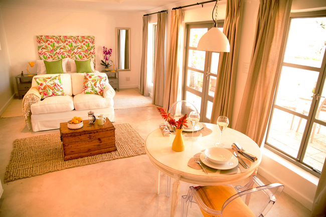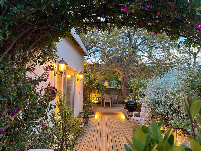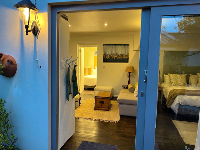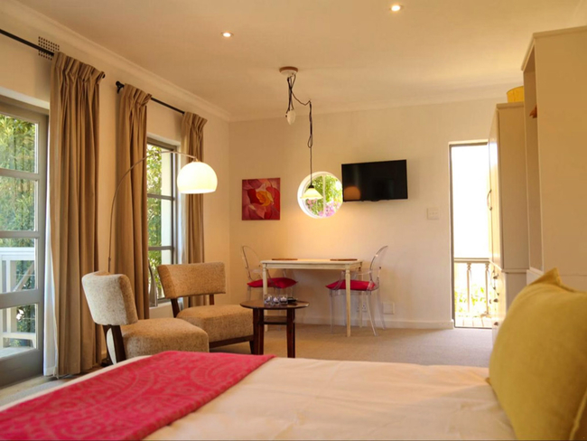 This charming garden cottage offers a spacious one-bedroom layout with an en-suite bathroom and a comfortable queen-size sleeper couch in the open-plan lounge, ideal for small families or additional guests. The cottage includes a full kitchen equipped with a stove, fridge, microwave, and all necessary cookware and utensils, allowing for a convenient self-catering experience. The large bathroom, fitted with a walk-in shower and hairdryer, opens directly onto the patio, creating a seamless indoor-outdoor flow. Guests can relax on the private patio, which features outdoor seating and a built-in BBQ, perfect for alfresco dining. Additional comforts include air conditioning, a sitting area, a work desk, coffee and tea-making facilities, full DStv, high-speed fibre Wi-Fi, and regular cleaning service. With access to both a patio and a terrace, this cottage is an inviting retreat for relaxation and leisure.
