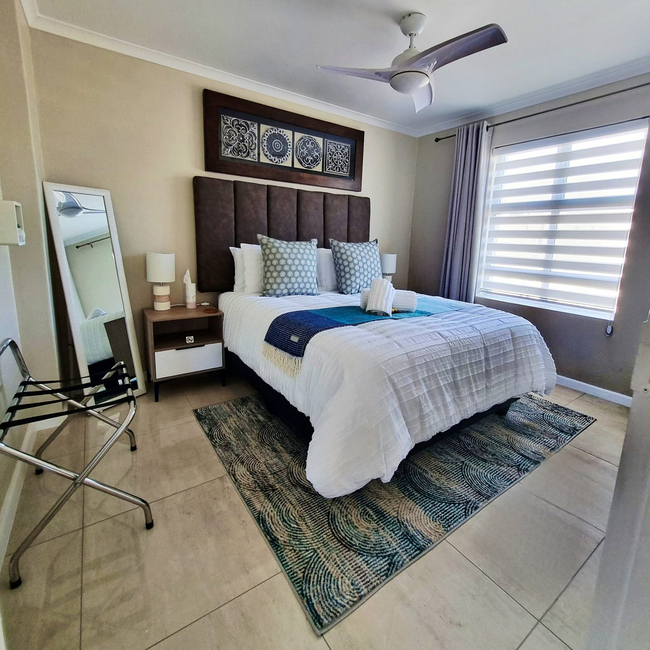 The spacious apartment comfortably accommodates 4 adults and 1 child and features two well-appointed bedrooms. The main bedroom is furnished with a queen-size bed and includes an en-suite bathroom fitted with a shower, washbasin and toilet. The second bedroom also has a queen-size bed and a cot, with guests making use of a separate bathroom, also fitted with a shower, washbasin and toilet. Quality linen, bath towels and soaps are provided for convenience. The open-plan living area includes a fully equipped kitchen with a stove, oven, microwave, fridge-freezer, cutlery and crockery, as well as a breakfast bar with stools. A washing machine and dishwasher add to the ease of longer stays. The adjoining lounge offers comfortable seating, a wall-mounted TV and access to free Wi-Fi. Sliding doors lead onto a furnished balcony, perfect for alfresco dining while enjoying the surrounding views. Guests also have access to excellent shared facilities, including indoor and outdoor swimming pools, a gym and a clubhouse. Secure parking is available throughout the stay.