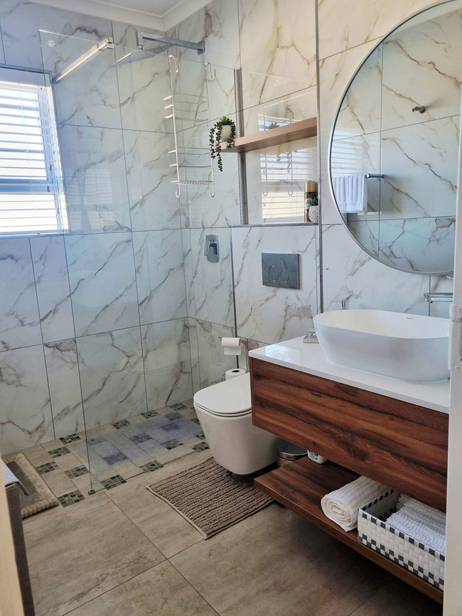 The second bedroom also has a queen-size bed and a cot, with guests making use of a separate bathroom, also fitted with a shower, washbasin and toilet. Quality linen, bath towels and soaps are provided for convenience.