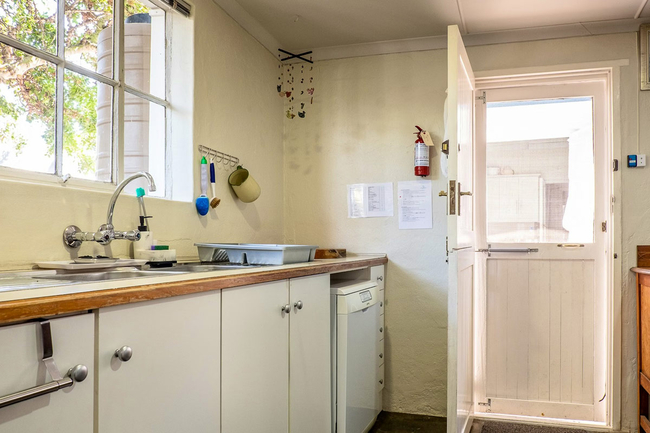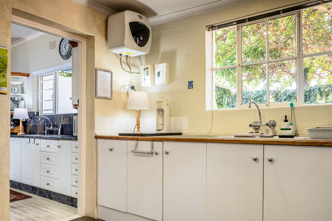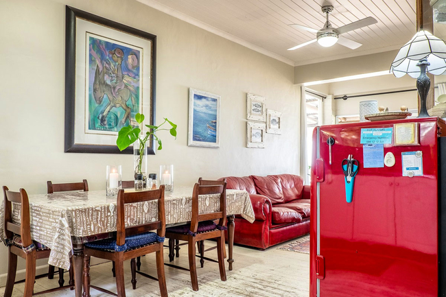 The kitchen is fully equipped for a seamless self catering experience and includes a Nespresso machine, a coffee maker, a five plate gas stove with an electric oven, a dishwasher, and a double door refrigerator. The open plan design incorporates a dining area, complemented by comfortable seating, creating a welcoming environment for shared meals and conversation. Sliding doors lead to a covered veranda where guests may enjoy a traditional braai while appreciating uninterrupted views of the ocean.