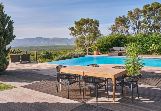 Master bedroom en-suite. Mezzanine with two large beds/separate bathroom. Fireplace; under-tile heating. Ideal for family with up to 4 children (depending on age). Equipped for s/c, incl. BBQ. Views over fynbos to Kleinriver Mountains.