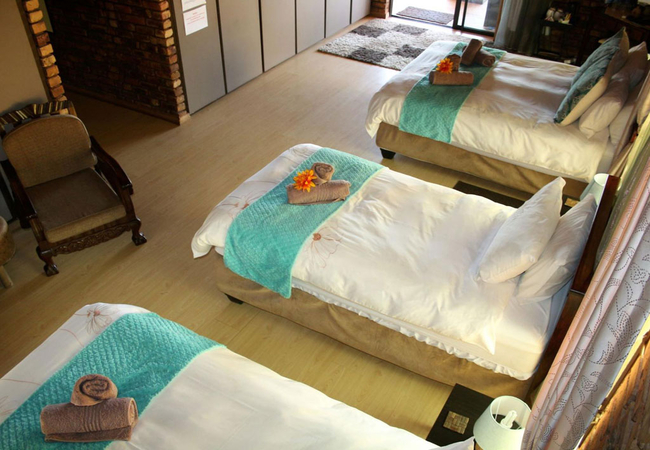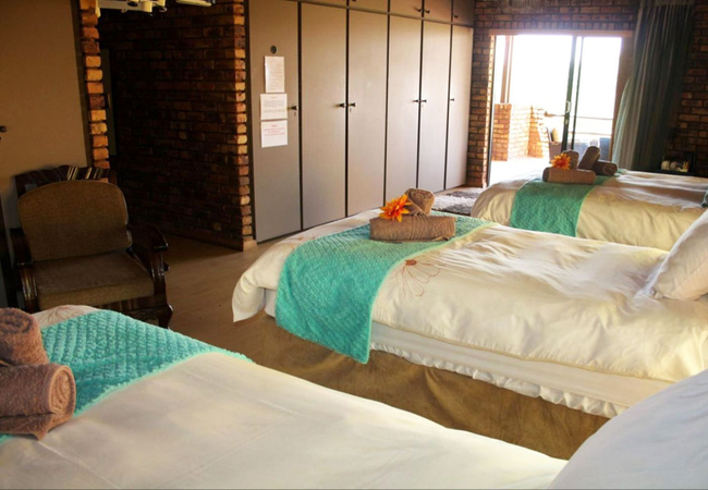 Room 6 is furnished with a double bed and two single beds. There is an en-suite bathroom fitted with a shower, toilet and basin. Room facilities include DStv, tea / coffee facilities, Wi-Fi and air-conditioning. The room also has a balcony furnished with a table, chairs, umbrella and view of the dam.