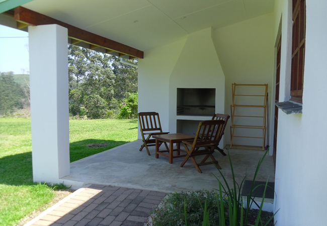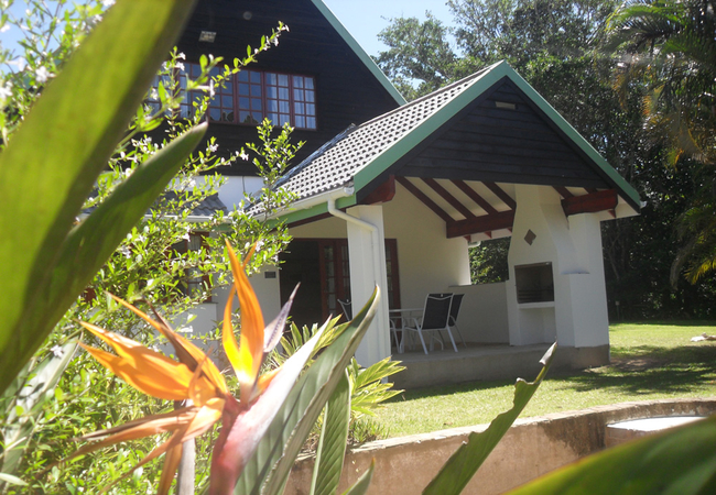 The spacious double-storey chalet has a bedroom and a loft room with comfortable beds, sharing a full bathroom. The kitchen has a gas stove and dining area, opening onto covered verandah with a braai. A TV with local channels and Wi-Fi is also available.