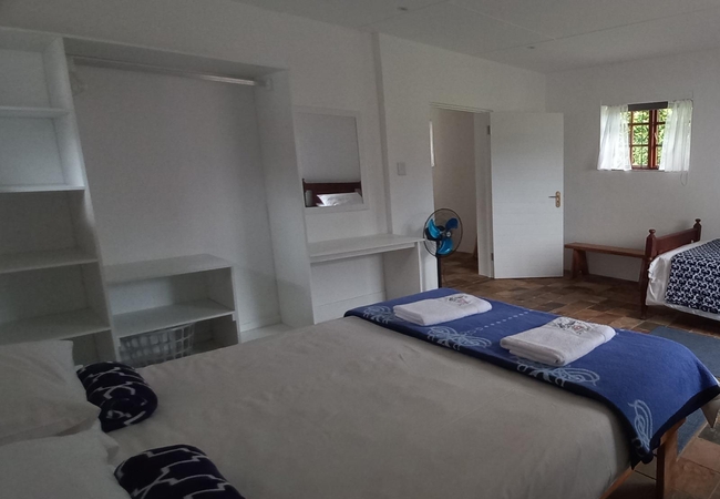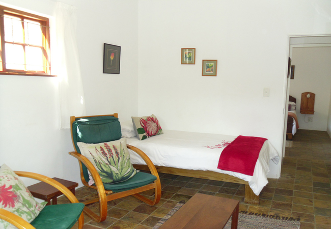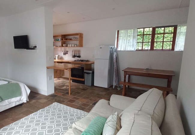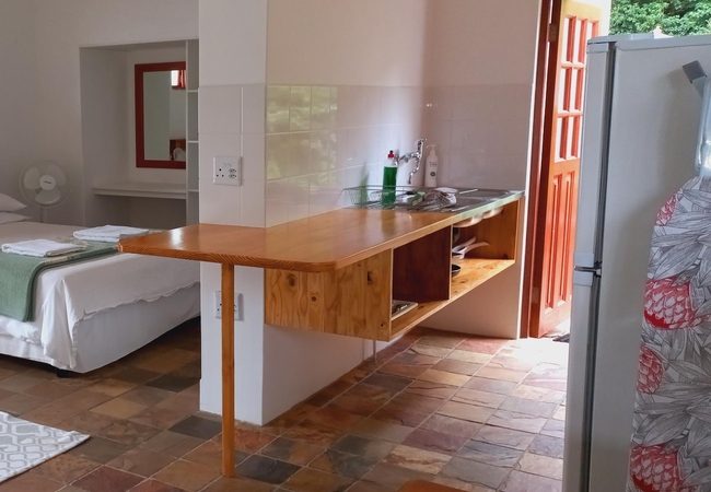 The unit is furnished with a queen-size bed in the room and open-plan living area with a single bed, and 2 shower-only en-suite bathrooms. The kitchen has a gas stove and a TV with local channels and Wi-Fi is available. The unit opens onto a verandah with a braai.