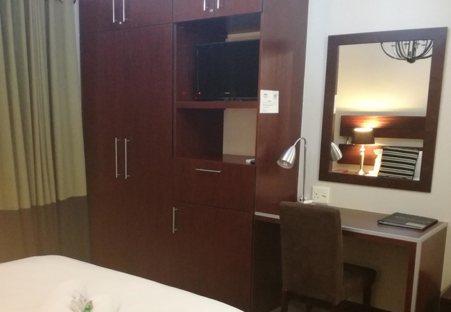 Room One is a Double Room furnished with a double bed. The room has an en suite bathroom equipped with a shower. Room has airconditioning, TV with selected DSTV channels, Free Wi-Fi, bar fridge, coffee/tea, desk and reading lamp.