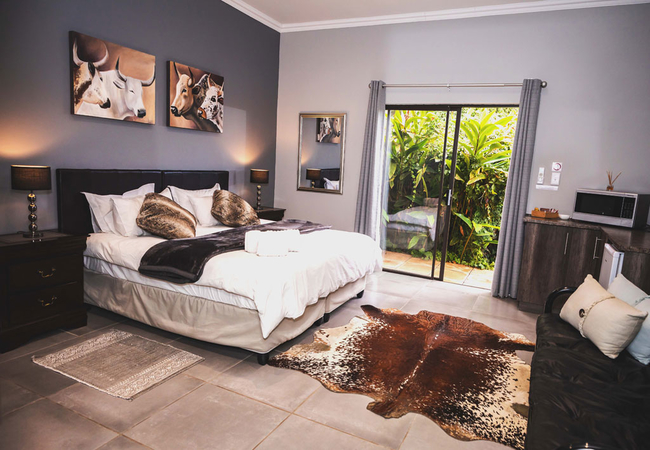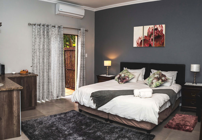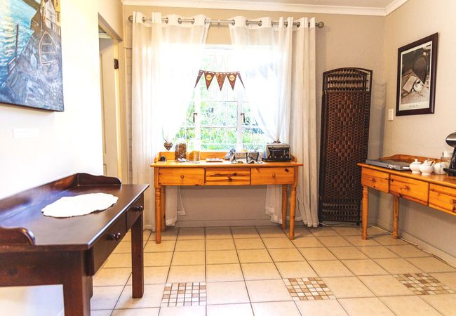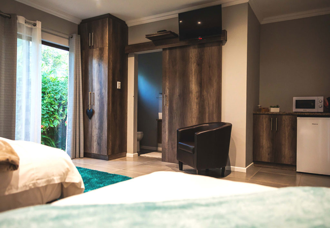 Dankbaar is furnished with two single beds or a King-size bed if preferred. There is private entrance and private patio to each room. There is an en-suite bathroom, a work station, TV with DStv / satellite channels, air conditioner, microwave oven, fridge, coffee / tea amenities and unlimited Wi-Fi.