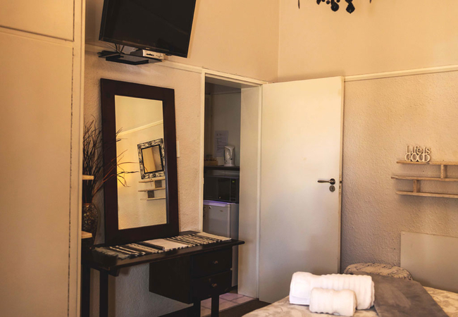There is private entrance and private garden-patio to this room. Geloof is furnished with a King-size bed with an Bachelor open/plan shower facilities. Suitable for a single person. The room is equipped with a TV with DStv and air conditioner. With a fridge, microwave, kettle, coffee and tea amenities etc.