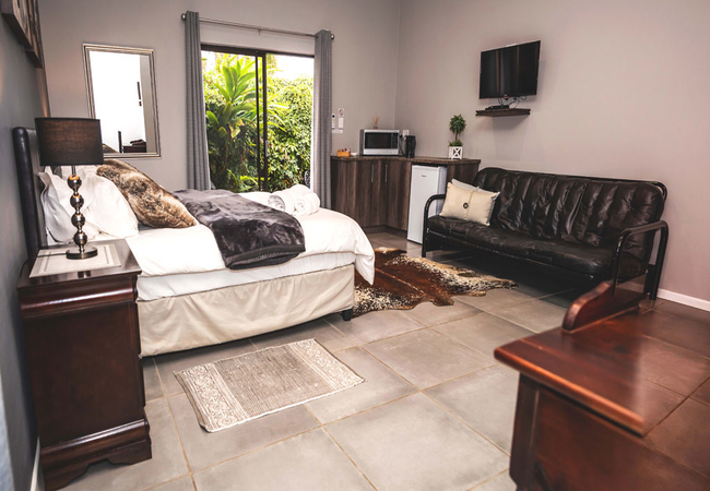 Liefde is furnished with two single beds or a King-size bed if preferred and a sleeper couch. There is private entrance and private patio to each room. There is an en-suite bathroom, a work station, TV with DStv / satellite channels, air conditioner, microwave oven, fridge, coffee / tea amenities and unlimited Wi-Fi.