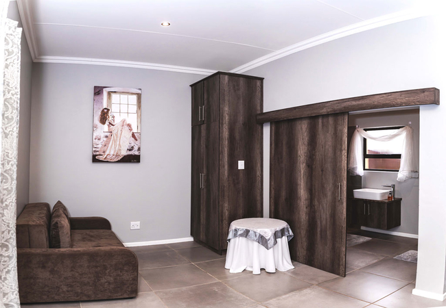 Genade is furnished with two single beds or a King-size bed if preferred and a sleeper couch. There is private entrance and private patio to each room. There is an en-suite bathroom, a work station, TV with DStv / satellite channels, air conditioner, microwave oven, fridge, coffee / tea amenities and unlimited Wi-Fi.