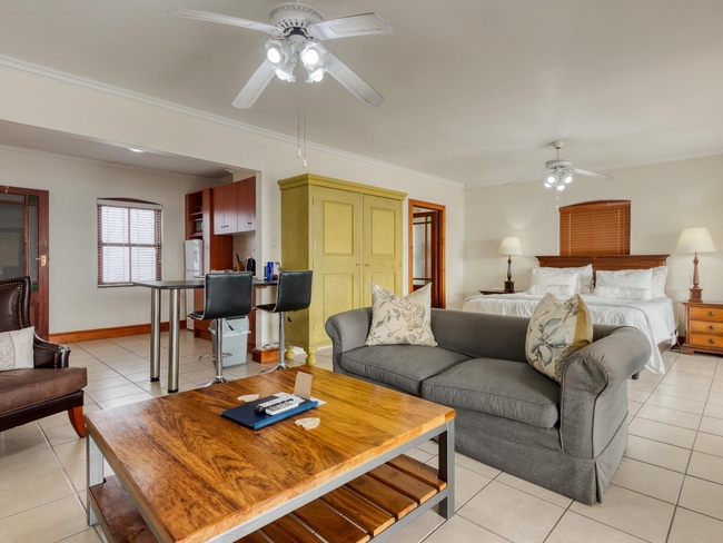 The largest suite is on the very top of the guesthouse with a 360 degree view and huge covered patio. There is a King-size bed and an en-suite bathroom with a bath and a shower. The air-conditioned suite has a flat screen TV with selected DStv channels, a kitchenette and a braai.
