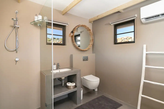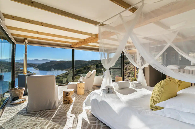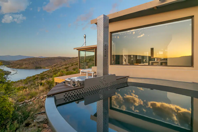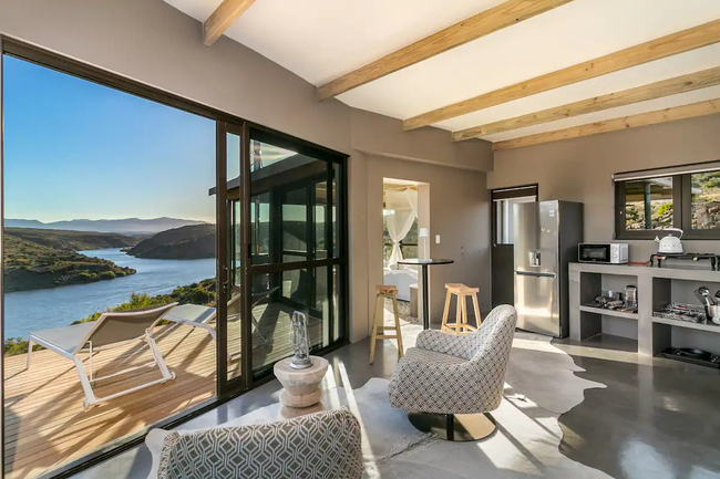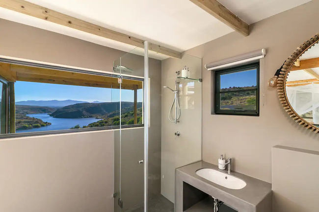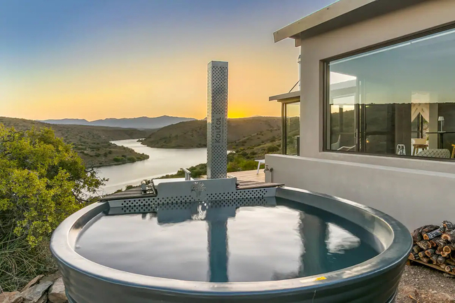 Indulge in the opulence of the off-the-grid mountain cottage, designed to accommodate two guests in absolute comfort. Perched amidst majestic mountains, lush valleys, and the shimmering dam, Berghuisie features a beautiful bedroom furnished with a King-size bed. The bath offers a sweeping panoramic view, while the cottage itself remains cozy with air-conditioning and the allure of both indoor fireplace and braai/BBQ facilities. Outside, a splash pool and a wood-fired hot tub beckon, offering yet more stunning views. Immerse yourself in the serene ambiance of Berghuisie, where every corner unveils a breathtaking panorama, whether you're lounging in bed, soaking in the bath tub with a view, or savouring a meal by the braai/barbecue area. Indoors, you'll find a spacious living area with a fireplace, a well-appointed kitchen, and the luxury of a private wood-fired hot tub. The cottage boasts a fully equipped kitchen, ensuring convenience amidst the tranquility of nature.