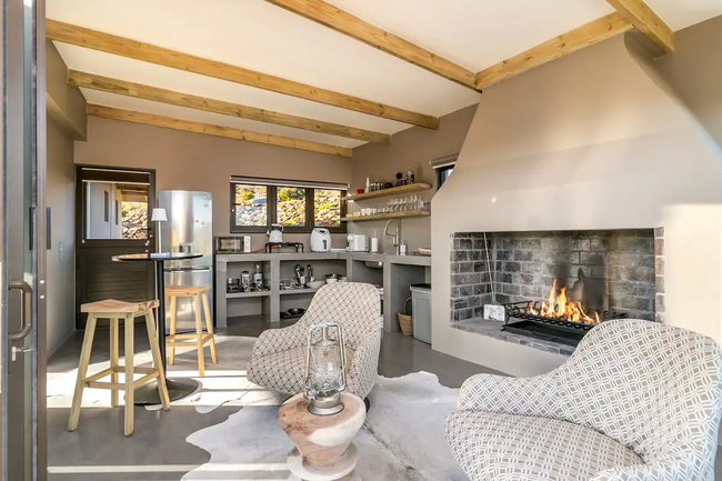 The bath offers a sweeping panoramic view, while the cottage itself remains cozy with air-conditioning and the allure of both indoor fireplace and braai/BBQ facilities. Outside, a splash pool and a wood-fired hot tub beckon, offering yet more stunning views.