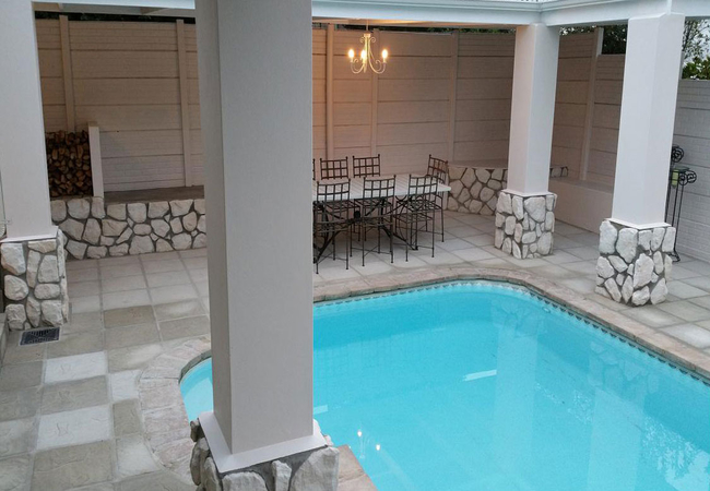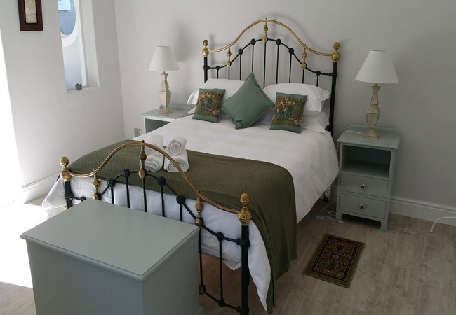 The cosy room option at Bergview Guesthouse. A lovely room with Double bed, en-suite bathroom with shower, double French doors which open onto a private courtyard with water feature. Lovely views of the garden and swimming pool.