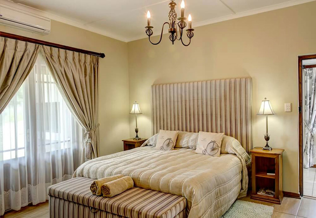 Luxury Double Rooms are furnished with a King-size bed and air-conditioning. The spacious en-suite bathroom is fitted with a spa bath, shower, separate toilet and double basins. the room is equipped with Wi-Fi, a bar fridge and tea / coffee making facilities.There are double doors opening onto a private patio overlooking garden and mountains.