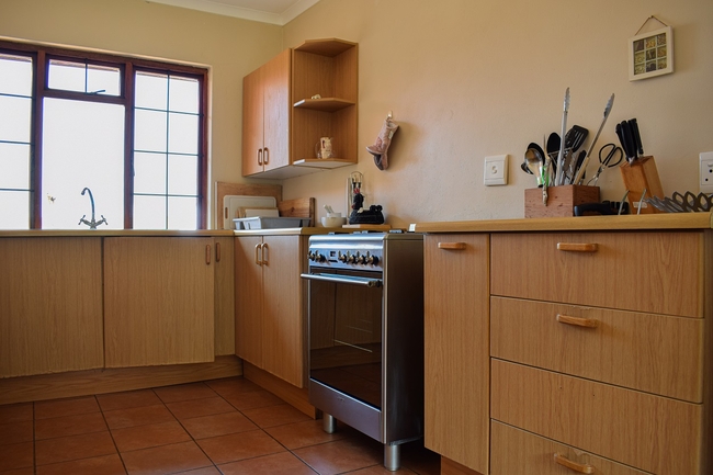 The kitchen is fully equipped and includes a stove, oven, fridge, microwave, dishwasher, kettle and toaster. The living, dining area and bar area are open plan with a fireplace and are comfortably furnished. There is a TV with DStv / satellite channels.