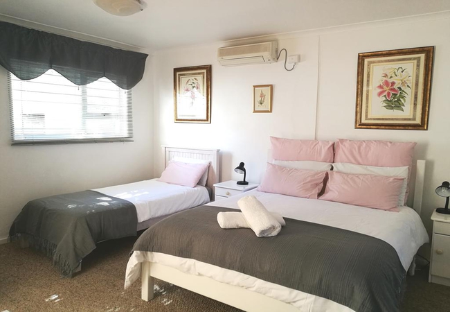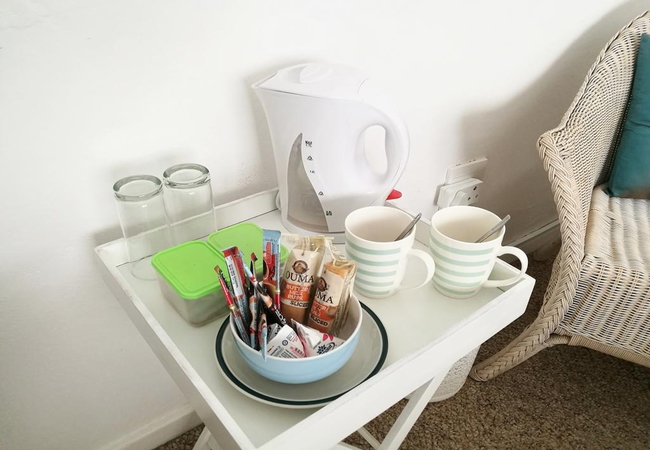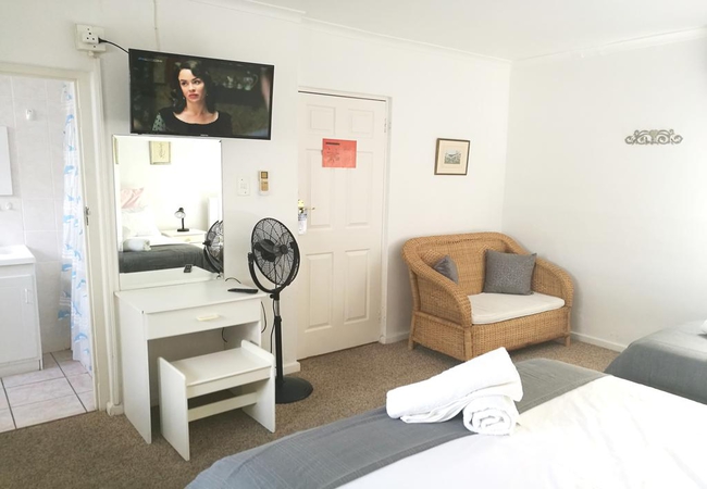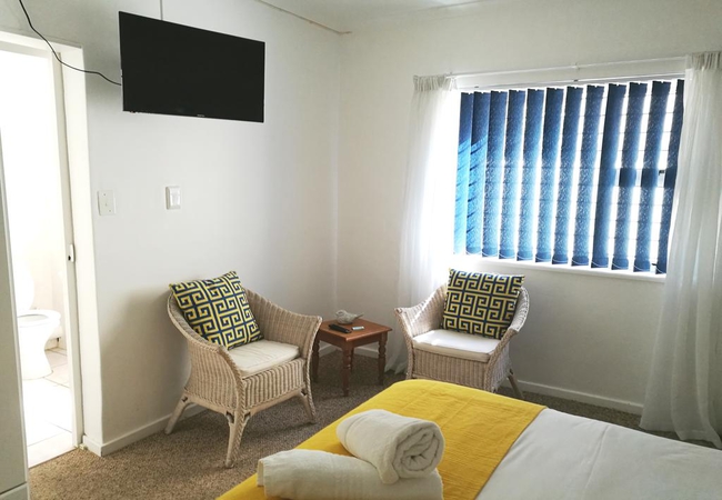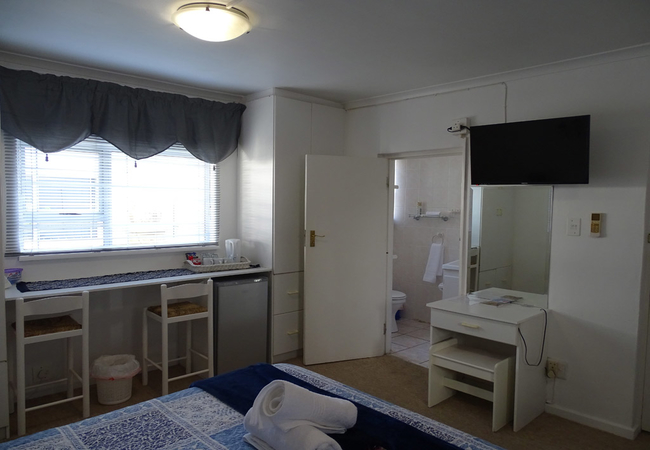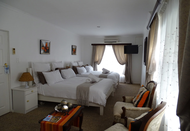 Spacious room with Queen-size bed, single bed and ensuite bathroom. There is a handy desk/work area. Room is air-conditioned with 32" flat screenTV, selected premium DSTV channels, fan, fridge, hair dryer, safe, electric blanket and tea/coffee facilities.
