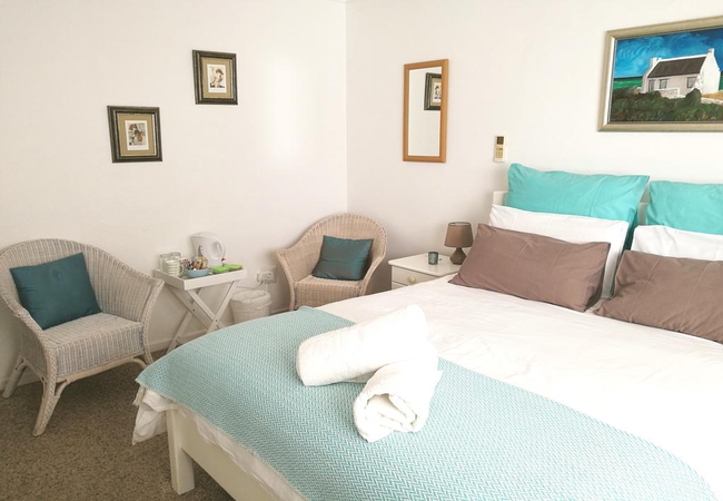 Spacious light room with two queen size beds and large ensuite bathroom. This air-conditioned room comes equipped with fridge, 32" flat screen TV, selected DSTV channels, electric blanket, fan, hair dryer, tea/coffee facilities and safe. .
