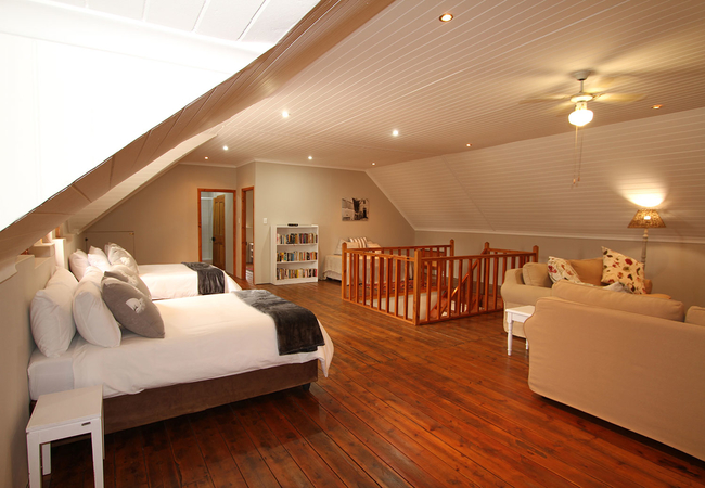 There is an upstairs lounge area with four double beds, a twin bed, a TV with DStv and a DVD machine. This area opens out onto a patio with mountain views.