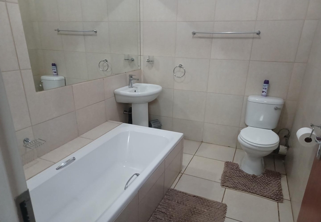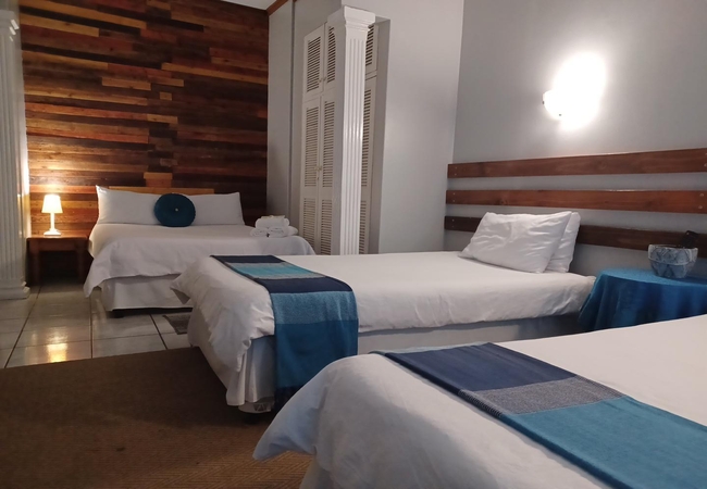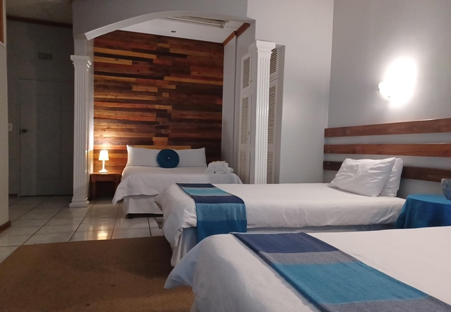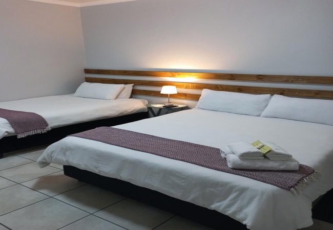 This Family room is furnished with a double bed and two single beds. It has an en-suite bathroom with bath. There is a fridge and microwave in the room. Rooms are equipped with Television and DStv, heaters, fans, tea and coffee facilities and rusks are provided. Rooms are serviced daily.