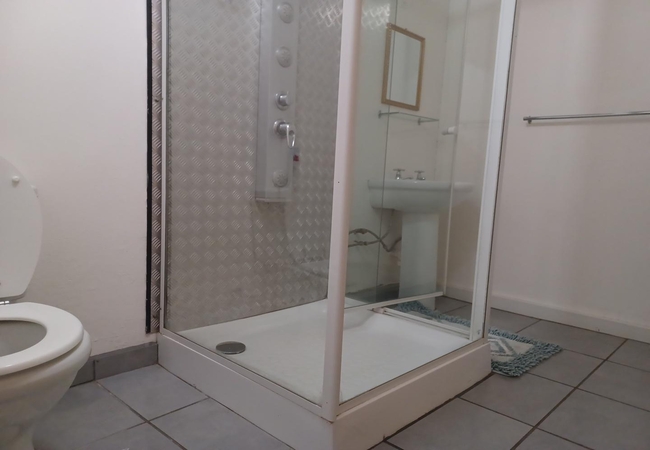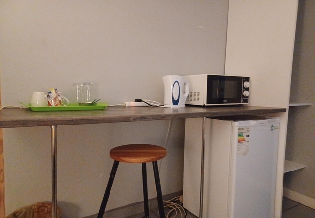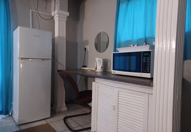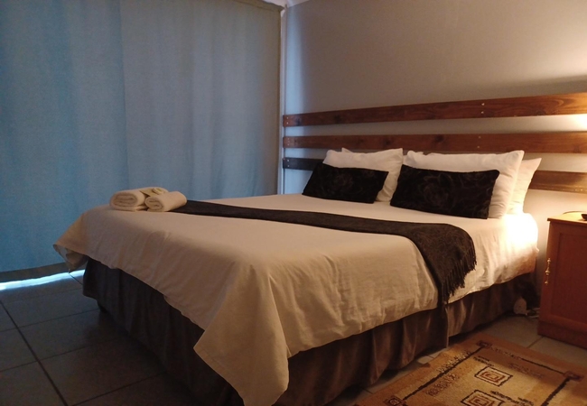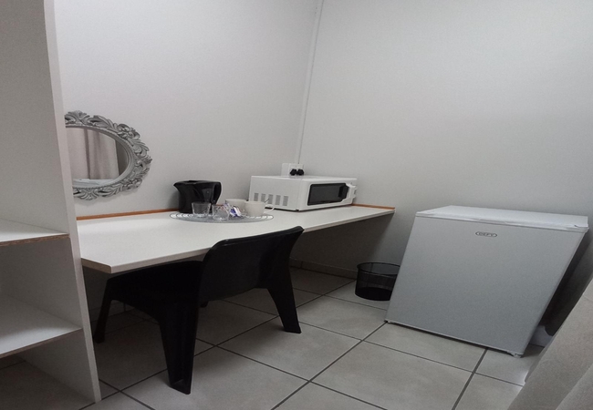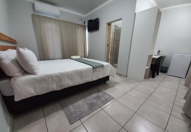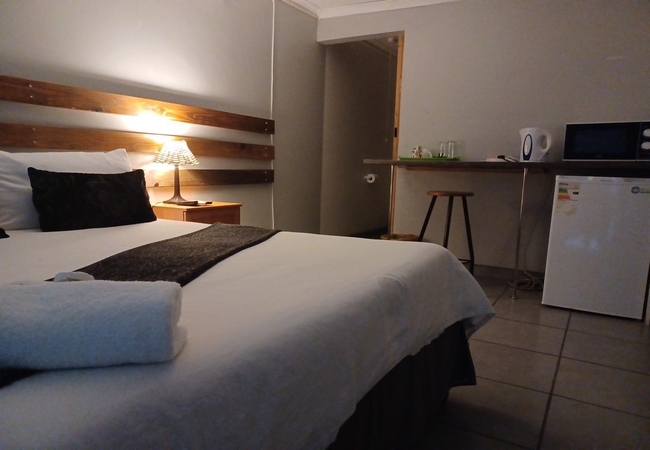 This Double Room is furnished with a double bed and en-suite bathroom with shower. Fridge and microwave. Rooms are equipped with Television and DStv, heaters, fans, tea and coffee facilities and rusks are provided. Rooms are serviced daily.
