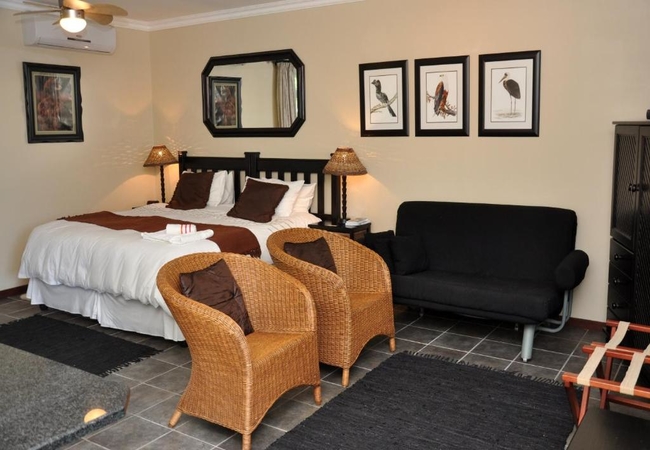 This double room has an interleading door to another double room. The room is furnished with a Queen-size bed and has a sleeper couch. The en-suite bathroom has a shower. The room has a well stocked tea tray, a TV with DStv and fans and heaters are available for your comfort.