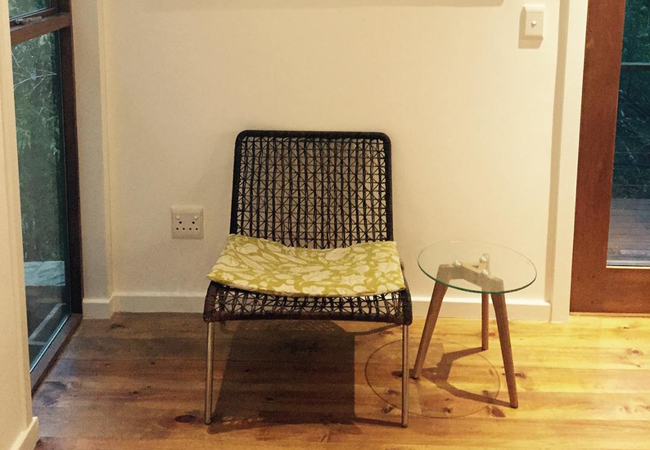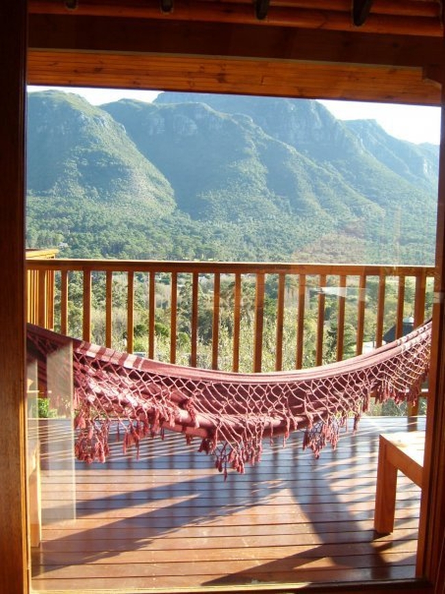 The main bedroom has a queen bed and glass sliding doors that lead onto a private covered deck with a hammock and chairs. The two large windows look out to the mountains from where the sun and the moon rise. A Victorian bath placed in the corner offers beautiful views to the forest and mountain peaks. A toilet and basin complete the en-suite bathroom. The second bedroom has twin beds and glass sliding doors that open up onto the main deck. The large window looks past the yellow wood tree and beyond to the mountains where the sun sets. The second bathroom has a walk in rain shower with a large window looking into the yellowwood tree. The wooden basin and toilet complete the bathroom. The kitchen is spacious and elegant. It is well equipped with a glass top stove and oven, fridge, dishwasher and microwave. All cooking utensils, crockery and glassware are fit for entertaining guests. The Lounge is elegant with high ceilings and hanging lampshades that mimic silk woven cocoons. The lounge extends onto the deck with foldaway glass doors on three sides that opens it up to the valley and the mountains. The deck has wooden table and chairs for the inevitable el-fresco dining and evening drinks. There is a barbeque for cooking on the open fire. The swimming pool is deep and playful and a wonderful place to soak up the African sun. The furnishings are organic and textures are of the earth: linen, cottons, sea grass, raffia, sisal, bamboo, knotted leather and sea shells. The hanging lamp shades mimic silk spun cocoons. The organic connection is not limited to the furnishings; the walls and floors are treated with plant oil on the inside and the house uses the African sun as its source of energy.
