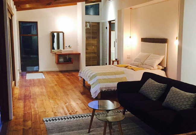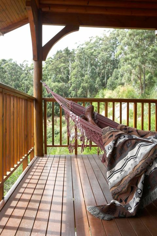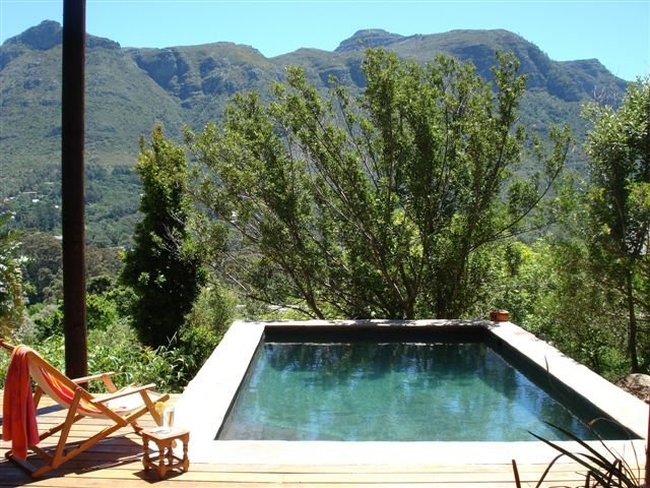 The cabin is set in two acres of indigenous garden and forest with rock formations, wild flowers and Koi fish ponds. The natural swimming pool, low slung hammocks and trampoline, make it the perfect natural playground for children.