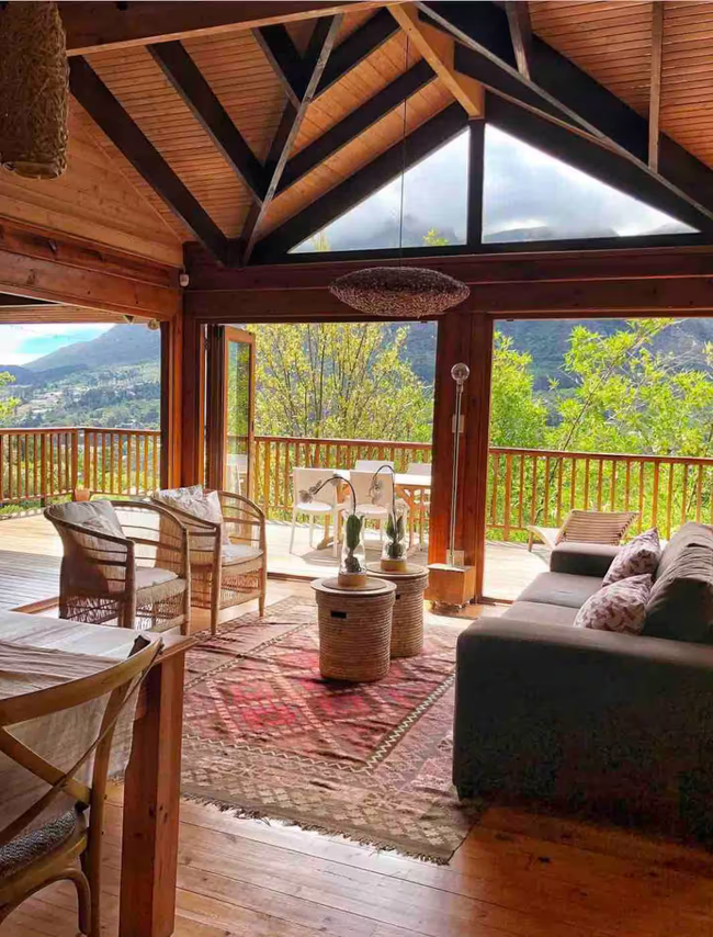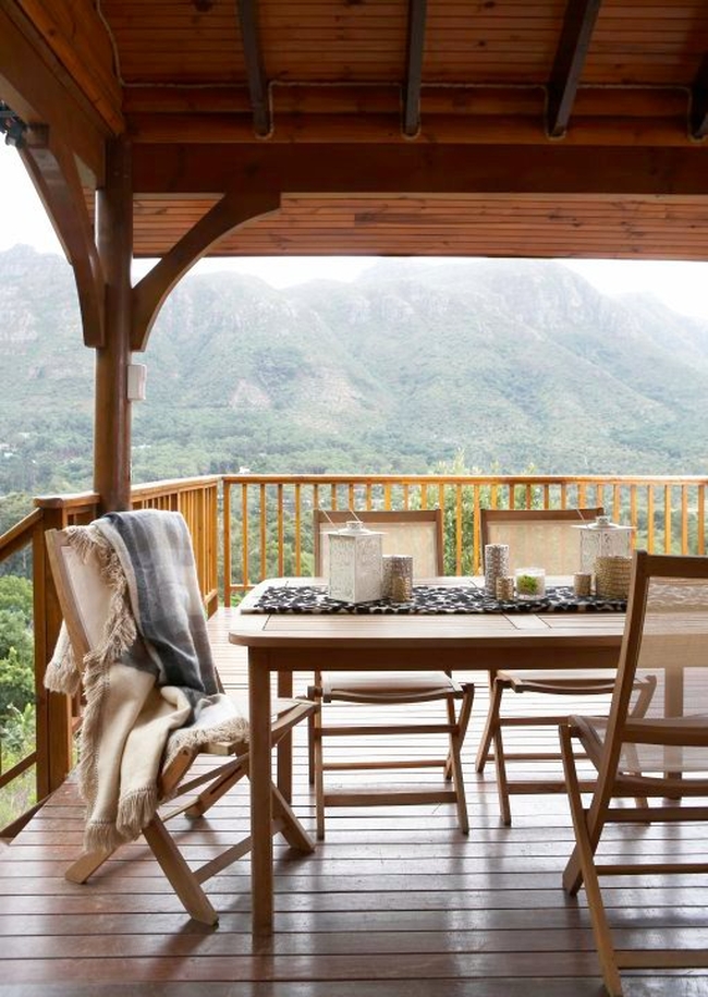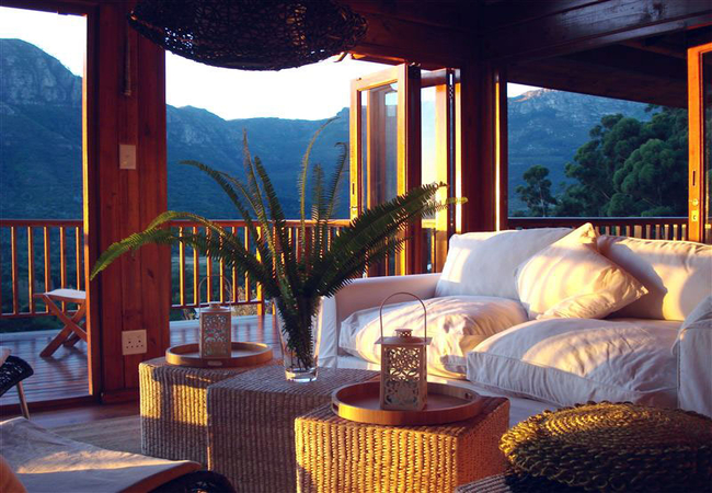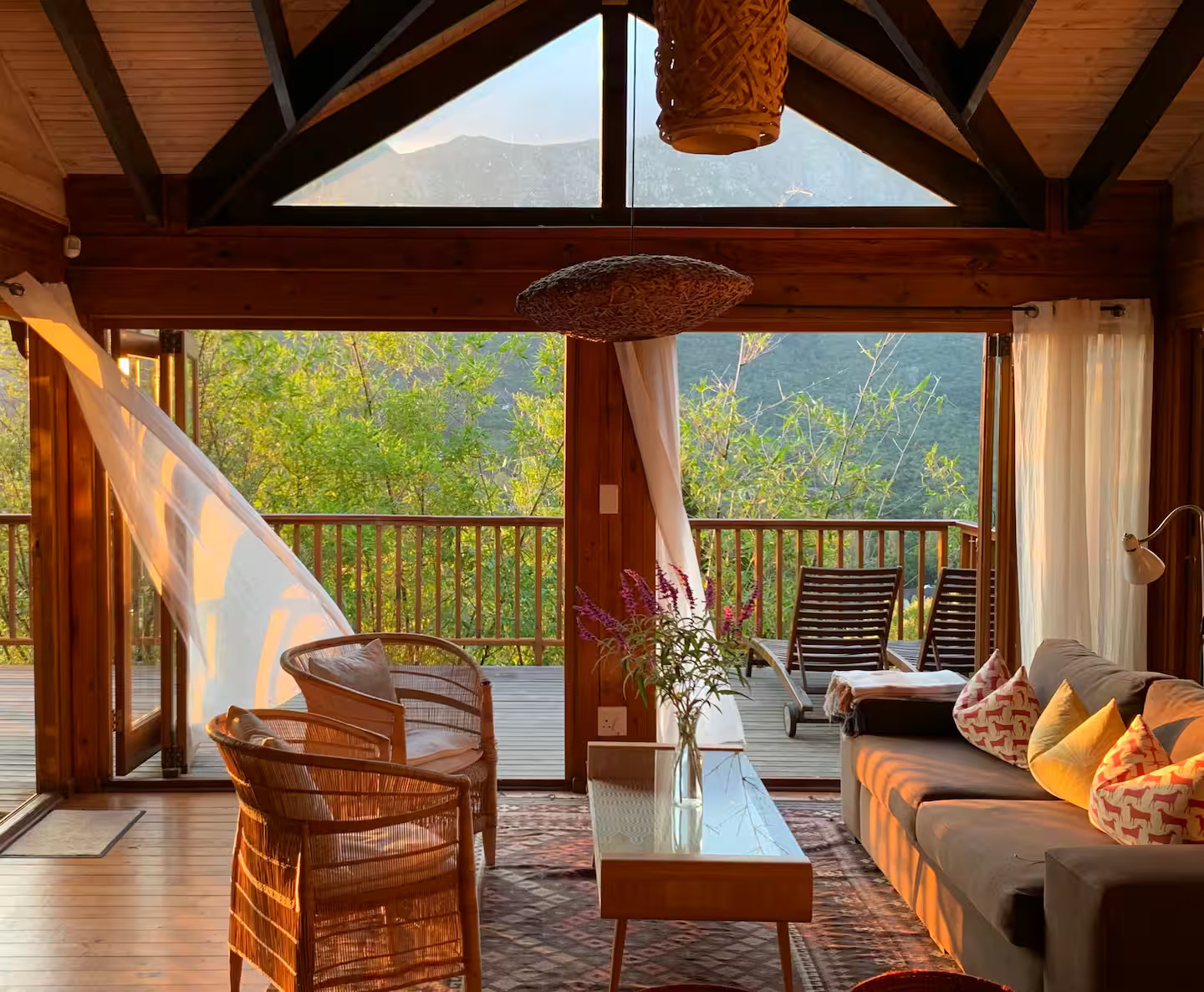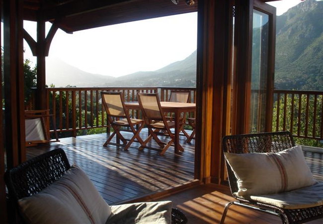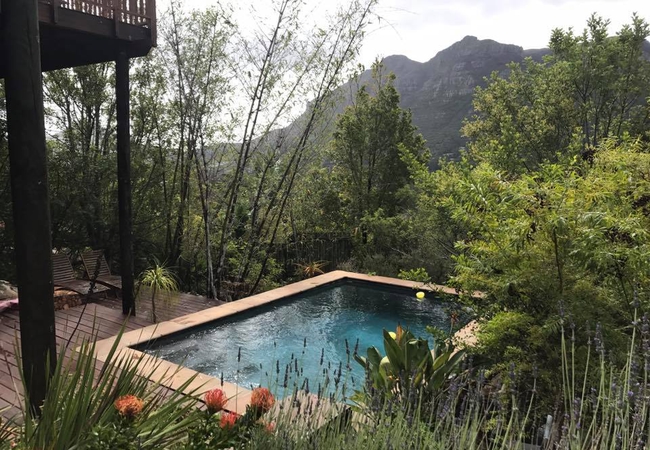 Set high on the mountain slopes of Hout Bay with panoramic views across the lush valley to the mountains of the 12 Apostles, blackwood log cabin clasps the side of the mountain like an eagles nest. Tranquil and quiet, here you can simply be in and appreciate nature.