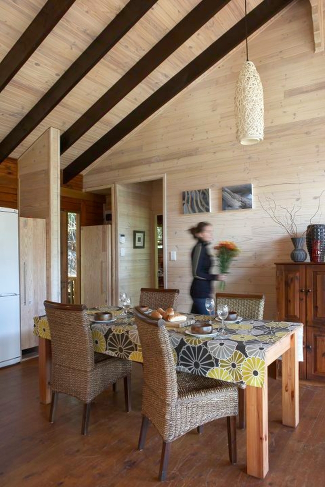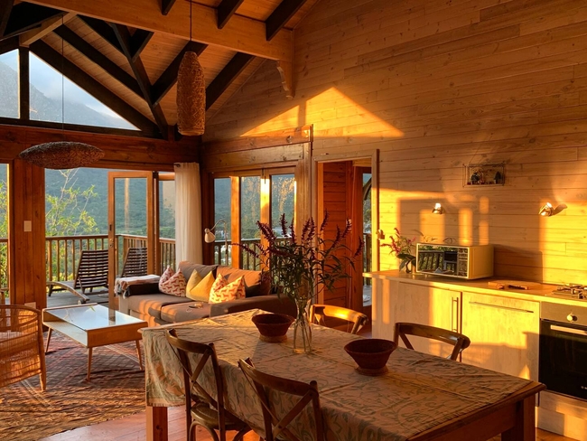 The Lounge is elegant with high ceilings and hanging lampshades that mimic silk woven cocoons. The lounge extends onto the deck with foldaway glass doors on three sides that opens it up to the valley and the mountains.