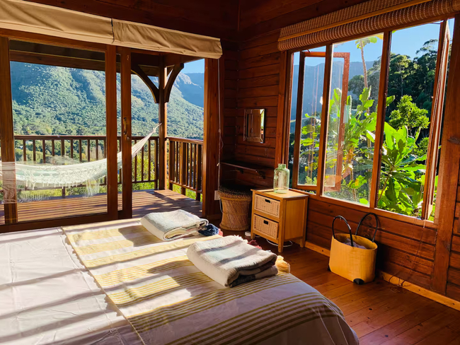 The main bedroom has a queen bed and glass sliding doors that lead onto a private covered deck with a hammock and chairs. The two large windows look out to the mountains from where the sun and the moon rise. A Victorian bath placed in the corner offers beautiful views to the forest and mountain peaks. A toilet and basin complete the en-suite bathroom.