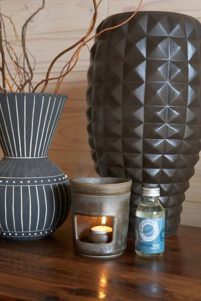 The furnishings are organic and textures are of the earth: linen, cottons, sea grass, raffia, sisal, bamboo, knotted leather and sea shells. The hanging lamp shades mimic silk spun cocoons. The organic connection is not limited to the furnishings; the walls and floors are treated with plant oil on the inside and the house uses the African sun as its source of energy.