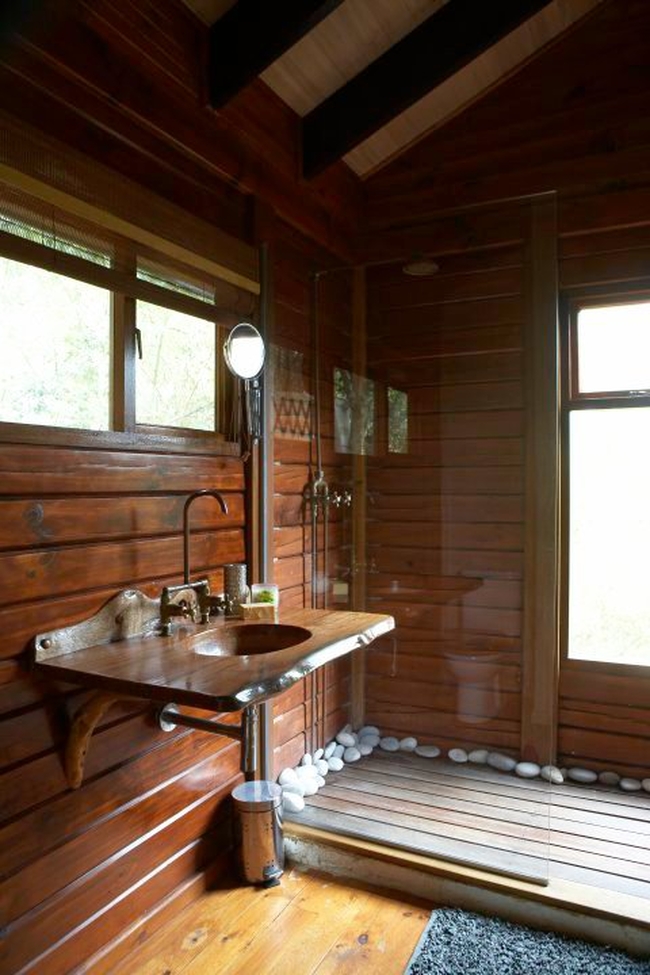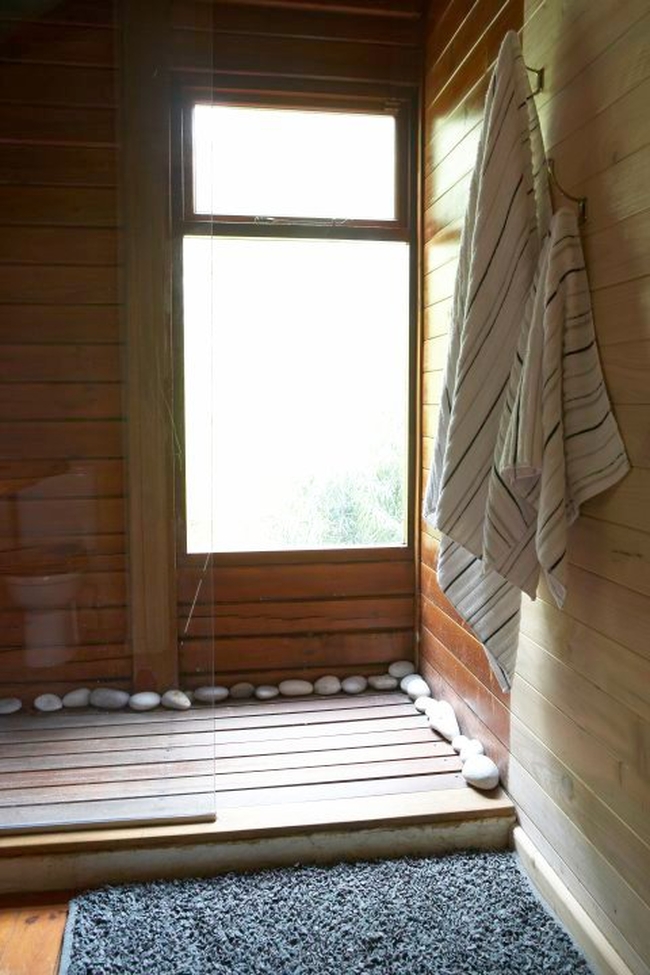 The second bedroom has twin beds and glass sliding doors that open up onto the main deck. The large window looks past the yellow wood tree and beyond to the mountains where the sun sets. The second bathroom has a walk in rain shower with a large window looking into the yellowwood tree. The wooden basin and toilet complete the bathroom.