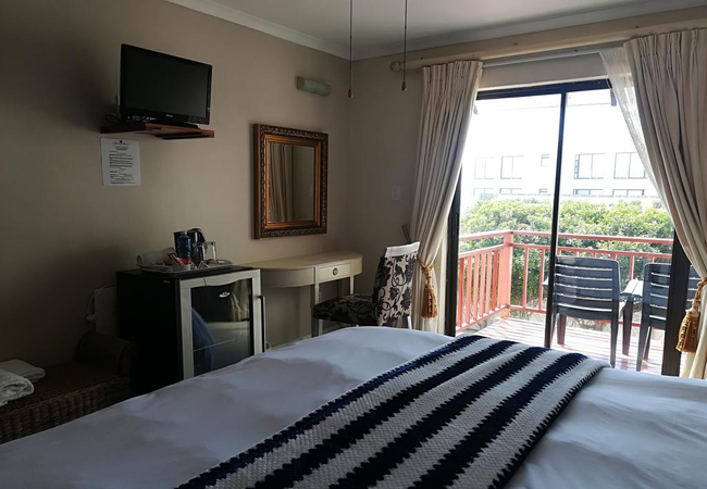 The Luxury Queen room is furnished with a Queen-size bed and a large private bathroom with a shower. There is a balcony and sea view. The room boasts a TV with DStv / satellite channels, deluxe toiletries, bottled water, a hair dryer and a coffee bar.