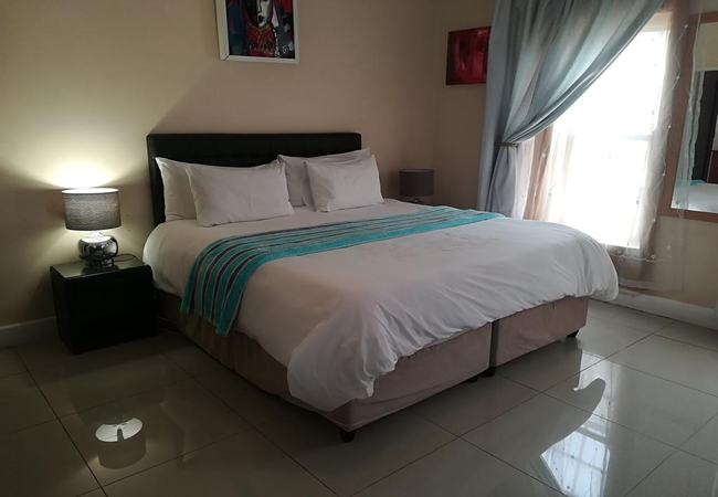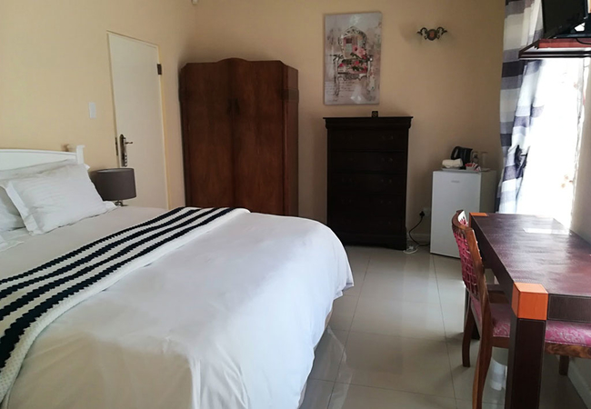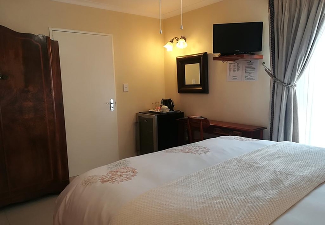 The Standard Queen room is furnished with a Queen-size bed and a bathroom with a large shower. The room boasts a TV with DStv / satellite channels, deluxe toiletries, bottled water.