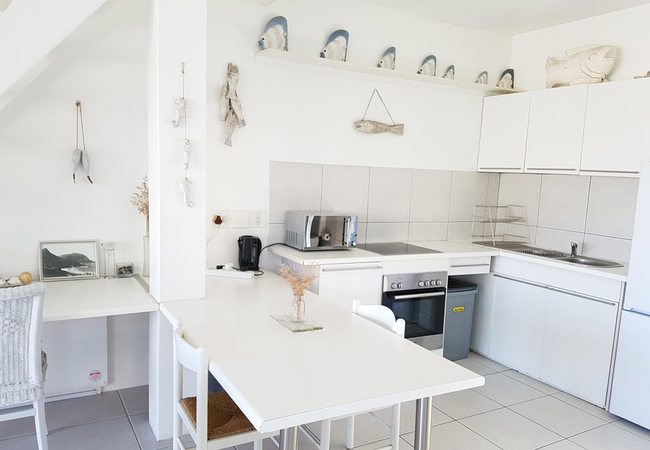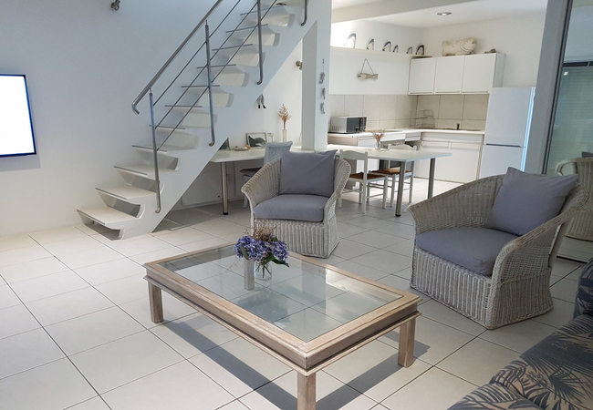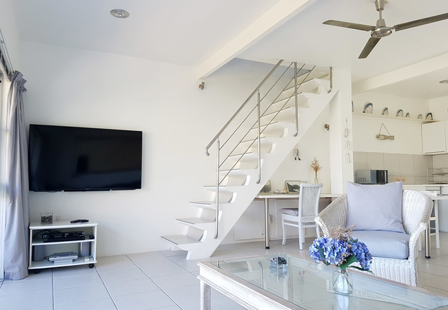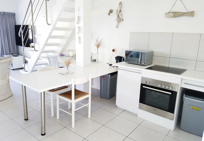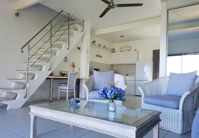 The penthouse sleeps two guests in an open plan apartment with a Queen-size bed in the loft up fairly steep stairs and a bathroom at lounge level with a shower. There is an open plan sleeping area, lounge, dining and kitchen. The kitchen is fully equipped for self catering.