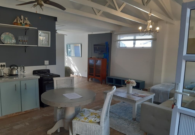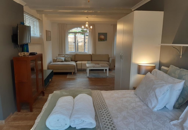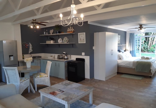 Dragonfly Cottage is an open-plan cottage with exposed beams and a King-size bed with an en-suite bathroom containing a shower, toilet and a basin. The kitchen has a stove, oven, fridge, microwave, tea / coffee making facilities, crockery and cutlery. It has a dining area with ample seating where guests can enjoy their meals together. There is also a TV with DStv. The apartment opens out onto a private garden with braai facilities.