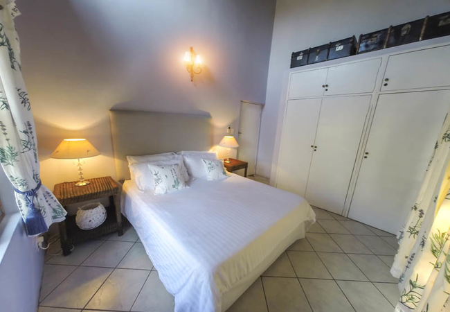Upstairs there is a living area that includes comfortable furniture, a coffee table and splendid views of the garden. There is access to the balcony, through sliding doors, via the living area. There is also another living room for guests to relax in and it is fitted with cosy furniture and a book collection. There is a bar with stools for guests to sit and enjoy.