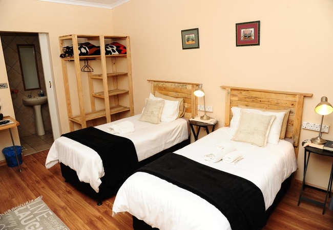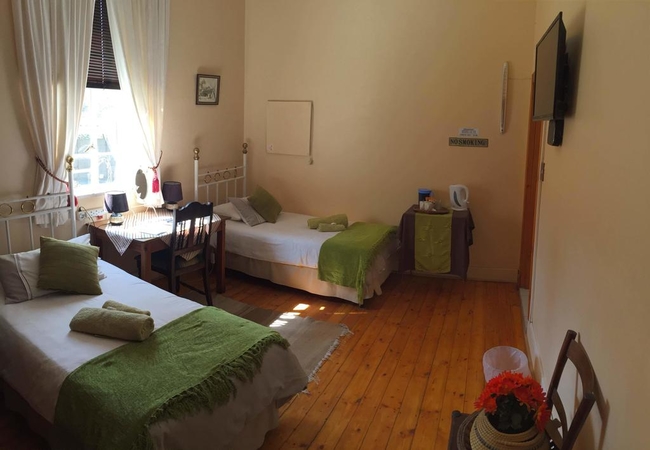 This is our most spacious room with two spacious outside windows. It has two twin single beds and there a space to put two more single beds. One of the two windows looks out on our beautiful garden wile the other looks out on the parking area. The room has a high ceiling with genuine old lead ceilings. The floors, door frames and doors is made of beautiful Oregon pine wood. The en-suite bathroom has a bath (with shower in the bath as well as basin and toilet. The following is standard in the room: Heater, wall fan, tea/coffee tray, flat screen plasma TV with DSTV, extra blankets, electric blankets, towels and soap are standard