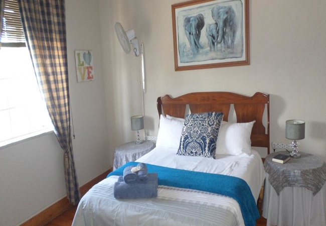 This room has its own entrance and little veranda. It has two single beds. This room has a wooden frame window that looks out on our beautiful garden. The en-suite bathroom has a shower as well as basin and toilet. The bathroom has a outside window. The following is standard in the room: Heater, wall fan, tea/coffee tray, flat screen plasma TV with DSTV, extra blankets, electric blankets, towels and soap are standard.