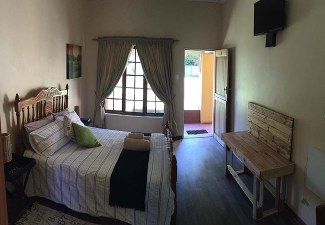 This room has its own entrance and little veranda. It has a double bed. This room has a wooden frame window that looks out on our beautiful garden. The en-suite bathroom has a shower as well as basin and toilet. The bathroom has a outside window. The following is standard in the room: Heater, wall fan, tea/coffee tray, flat screen plasma TV with DSTV, extra blankets, electric blankets, towels and soap are standard.