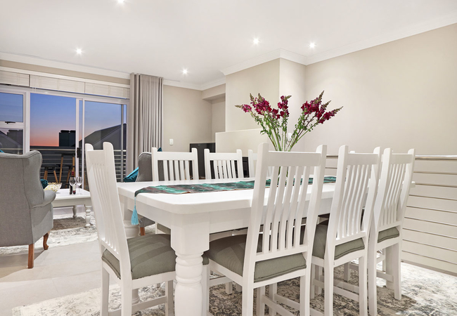 This Bona View apartment expands over two floors with the bedrooms and bathrooms located on the first floor and the entertainment and living area situated on the second floor. The main bedroom comprises of a Queen-size bed and boasts a sliding door that opens onto one of three balconies. The main bedroom also features an en-suite bathroom that is fitted with a shower. The second bedroom comprises of a Queen-size bed and the third bedroom of 2 x ž beds. The second and third bedroom shares the guest bathroom that is fitted with a bath and shower. The second floor consists of the fully equipped kitchen, dining area and living room. The kitchen features everything you will need for a self-catering holiday and boasts a Nespresso machine, dish washer, washing machine and tumble dryer. The door in the kitchen leads to a balcony at the back of the apartment that offers outside seating and the perfect place to create long lasting memories. The dining table can seat up to eight people for a delicious home cooked meal. The lounge is comfortably furnished and features a flat screen TV with DStv and Netflix and an inside fireplace that creates the perfect ambience for a relaxing holiday. The lounge opens onto a balcony that features a gas BBQ and partial views of the world famous Table Mountain.