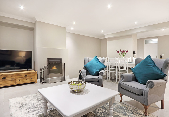 The lounge is comfortably furnished and features a flat screen TV with DStv and Netflix and an inside fireplace that creates the perfect ambiance for a relaxing holiday.