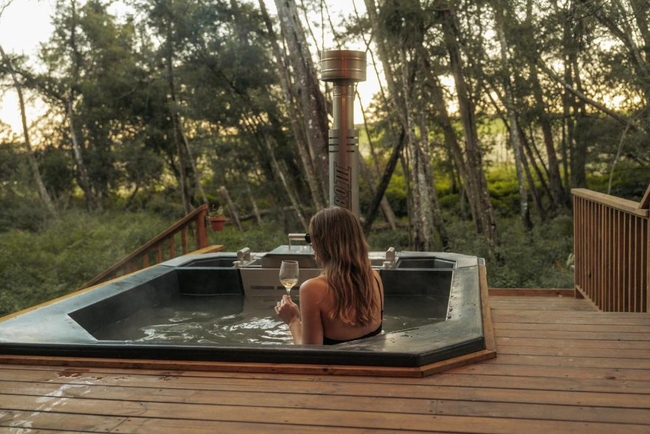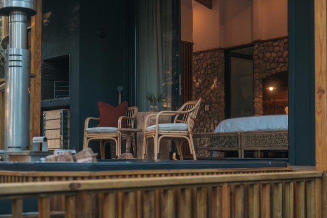 Designed to accommodate two guests, the cabin features a spacious king-size bed and a private en-suite bathroom, which includes a bathtub, both indoor and outdoor showers, a washbasin, and a toilet. High-quality linen and soft towels are provided for your comfort. The kitchenette comes fully equipped with essential conveniences such as a fridge-freezer, a two-plate gas stove, a microwave, as well as cutlery, crockery, and tea- and coffee-making facilities. The living area, warmed by a fireplace, is comfortably appointed with a cosy couch and a dining table, making it an inviting space to relax and unwind. Complimentary Wi-Fi is available for guests needing to stay connected. Step outside to a covered patio complete with a built-in braai and a wood-fired hot tub, perfect for starlit evenings. A firepit and a rustic pizza oven add to the charm of outdoor living. Guests are welcome to explore the property’s scenic hiking trail that winds along the Modder River, leading to a hidden waterfall and a crystal-clear freshwater pool. Mountain biking is also available for those craving a bit more adventure. Secure parking is provided on-site, and the cabin is conveniently located close to local shops and restaurants, making it easy to enjoy the best of both solitude and civilisation.